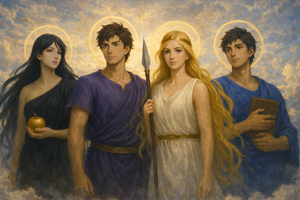 The Aetherian Faith—also called the Faith of the Four—is the predominant religion across much of Mundus and the state faith of Directionland. Its pantheon centers on four primary deities—Simonius (“the Father”), Odivia (“the Mother”), Alessa (“the Mournful”), and Darg (“the Enlightened”)—each associated with an elemental domain, a seasonal aspect, and a cardinal direction. Gold is held to be the sacred metal of the gods and is widely used in sanctuaries and rites.